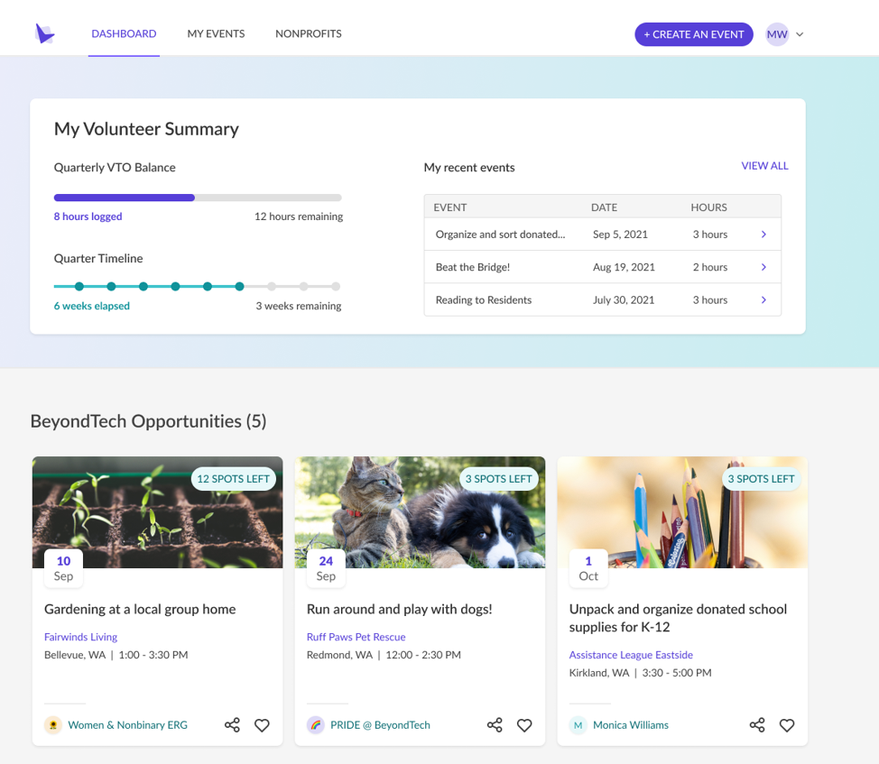 Submittable’s volunteering platform provides a single, easy-to-use dashboard for employees to find and sign up for opportunities as well as track their VTO and impact.