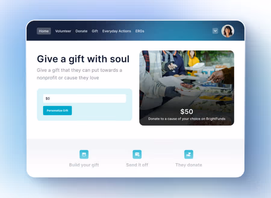 Bright Gifts empowers individuals to give the gift of philanthropy. When you give a Bright Gift, you’re sending donation credits to the recipient that they can then direct to over 8 million causes and charities. You can give Bright Gifts to anyone, whether they are part of your organization or not. This means that during the holiday season, for instance, you can give donation credits for GivingTuesday to your team, your colleagues, and external partners. It’s a thoughtful and inclusive way to make a difference together.