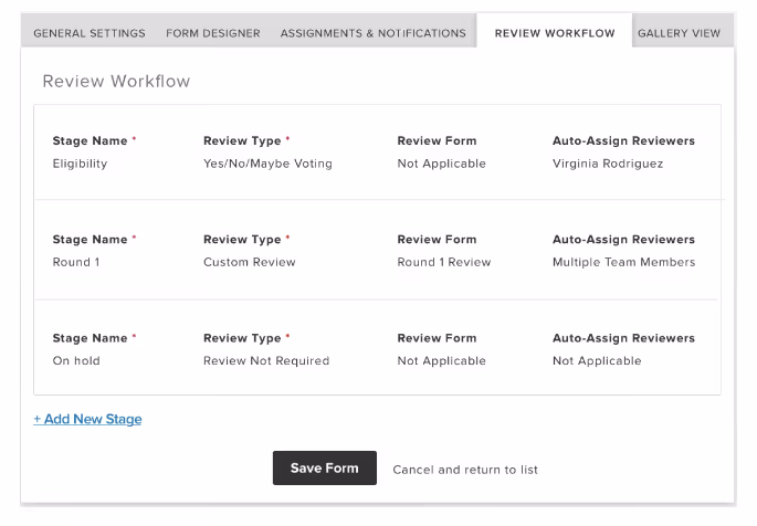 Add different rounds or levels to your review process to further organize the process—perhaps you first quickly toss out ineligible applications in the first round, then analyze applications for their sustainability, then make your final selections.