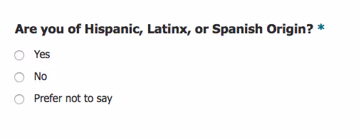 Categories are one of the biggest culprits of exclusion. While preset options can be helpful for form efficiency, they also imply that your potential applicant should fit into one of the categories you listed. Providing users a blank field to self-describe (example below) and use the answer they find most accurate for themselves establishes respect and makes applicants feel affirmed and included.