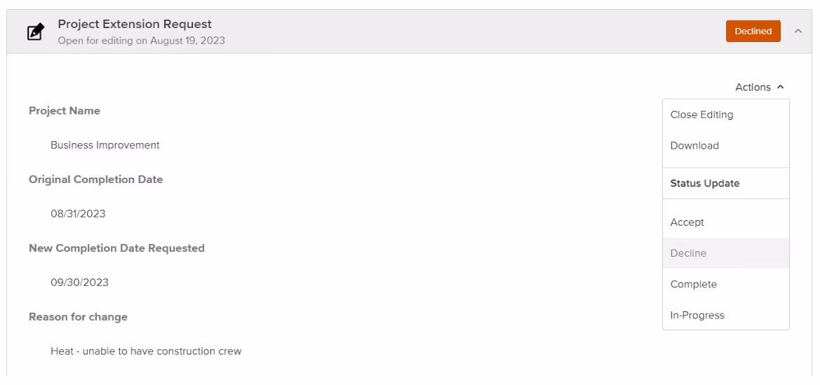 - From the Additional Forms page, toggle between sent vs. scheduled forms, and filter by Project, Status, Deadline, and Date Sent/Scheduled, and Status. Once filtered, you can rescind, add or edit scheduled dates or deadlines, open or close for editing, or send reminders (all in bulk!)