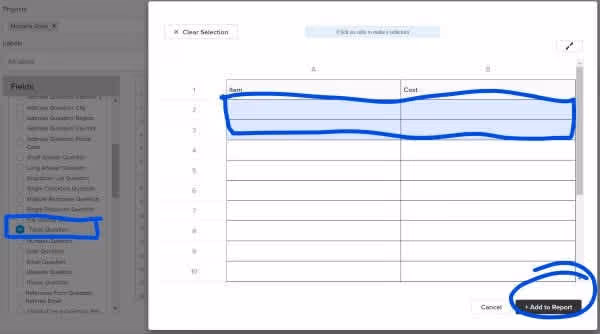 - Within the preview, click on the cell(s) you would like to add to the report. (To avoid an unruly report, you must make individual selections—there is no bulk select for a range of cells.) To deselect, click again or choose Clear Selections.