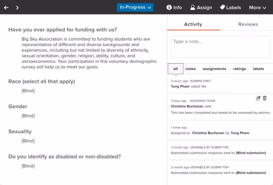 Submittable’s anonymous review feature hides demographic information or other identifiable information from judges so that subconscious bias is eliminated and awards are more just.