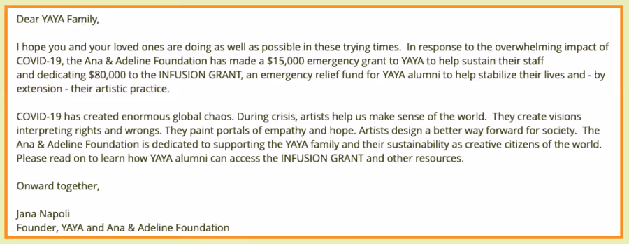 This letter from the Ana & Adeline Foundation laid out clear goals for their relief grants, administered through Submittable.
